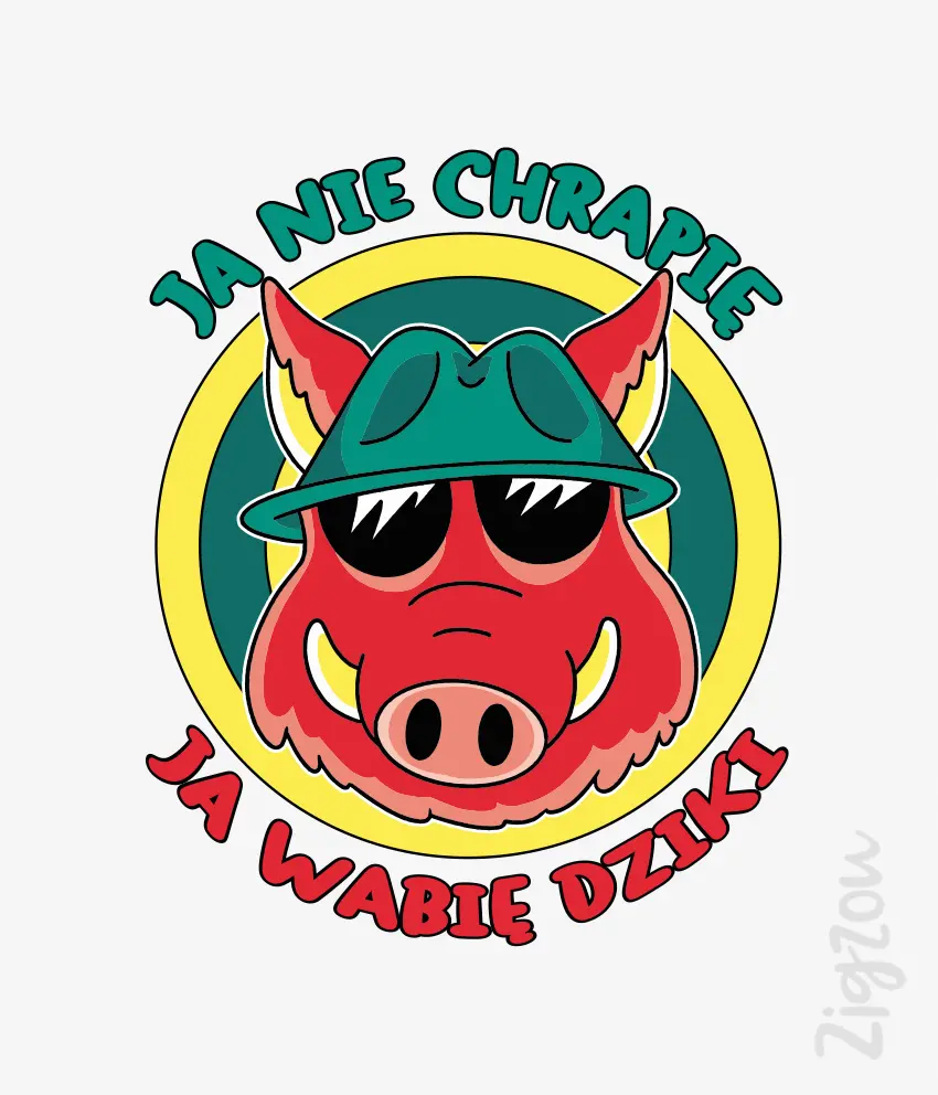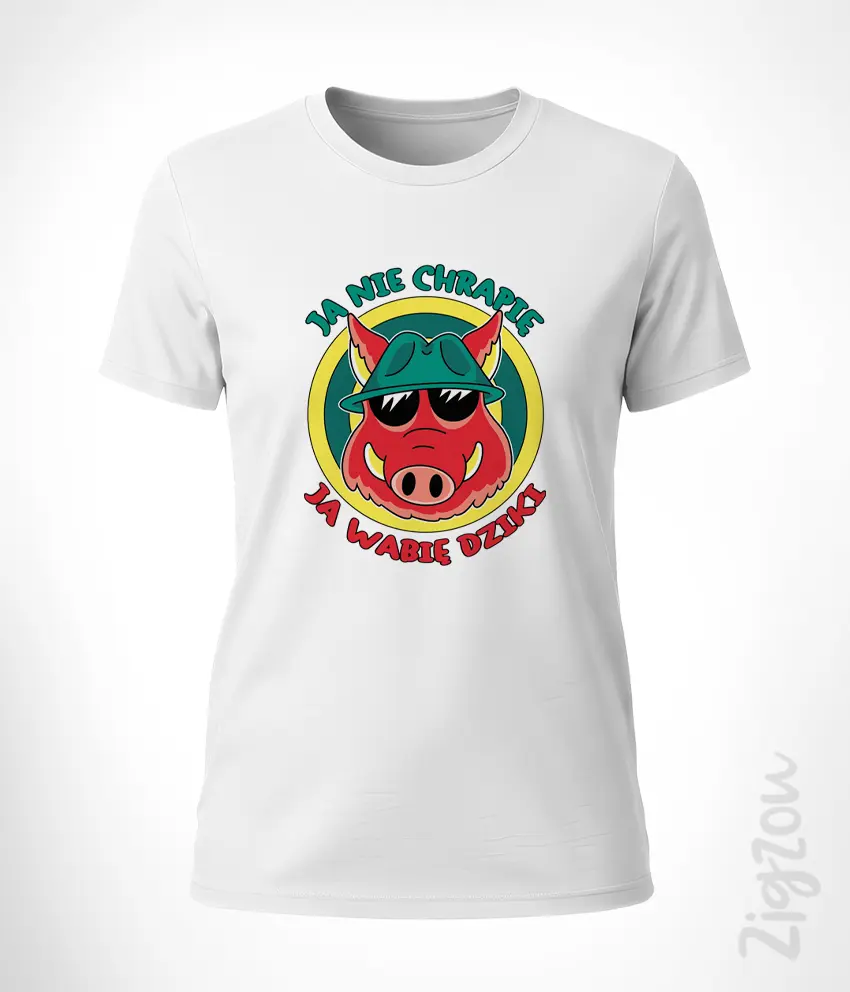 Koszulka z nadrukiem ja nie chrapię, ja wabię dziki. Humorystyczna grafika dla osób, które nie przyznają się do chrapania.