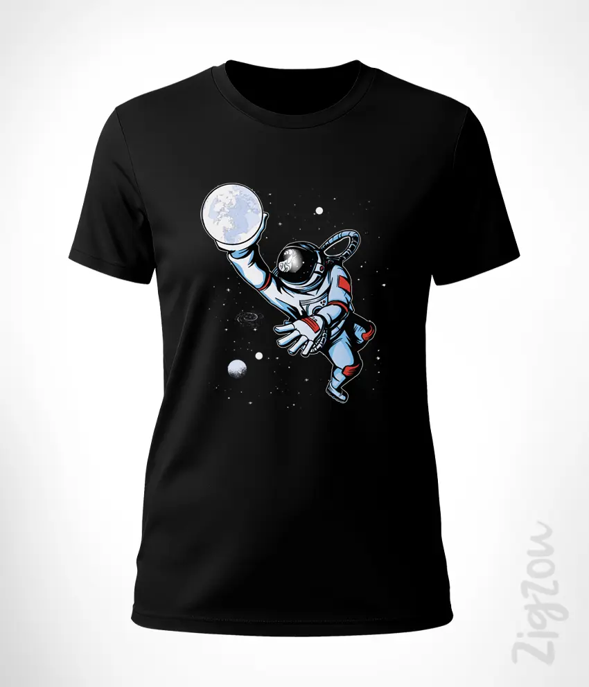 Nadruk na koszulce przedstawiającego astronautę wykonującego rzut piłką zamienioną w księżyc w kosmicznej scenerii tworzy dynamiczny i humorystyczny obraz. To motyw, który spodoba się zarówno fanom koszykówki, jak i osobom zainteresowanym tematyką kosmosu.