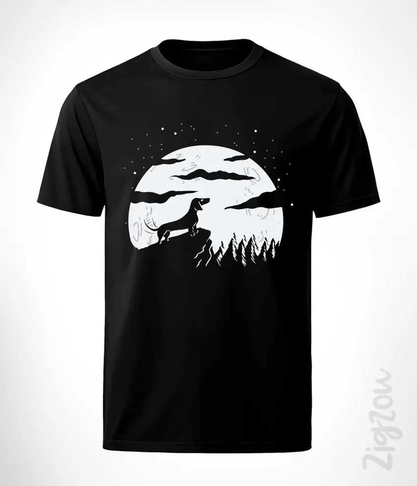 Stylowa koszulka z nadrukiem jamnik z księżycem. Idealna dla fanów psów, czy też samych jamników i nocnych klimatów.