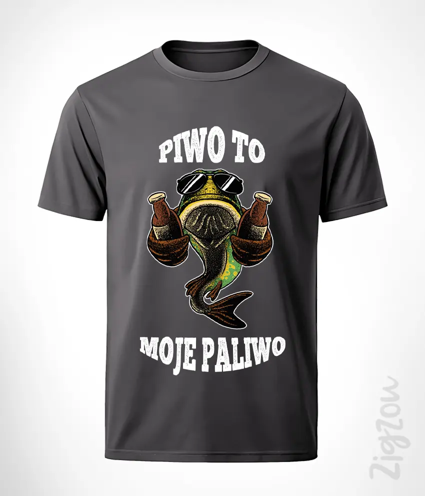 Koszulka z nadrukiem piwo to moje paliwo. Humorystyczny t-shirt dla wędkarzy i fanów dobrego humoru.